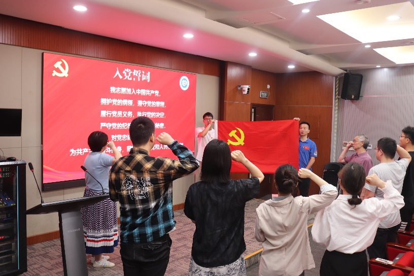 新入党研究生和全体毕业班党员在学院特邀党建组织员黄杉生监誓下,进行入党宣誓和重温入党誓词仪式。黄杉生老师叮咛毕业班党员要坚定理想信念,要有报国的志向,勇敢乐观地面对生活中的困难和挑战,为实现中华民族伟大复兴贡献自己的力量。
