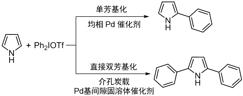 研究者设计了含C和N的Pd基间隙固溶体催化剂,提高Pd位点d带电荷密度,并通过多位点电子转移,构建了吡咯及衍生物C-H键直接双芳基化新反应,提高催化剂活性和选择性,一步获得2,5-二苯基吡咯等。