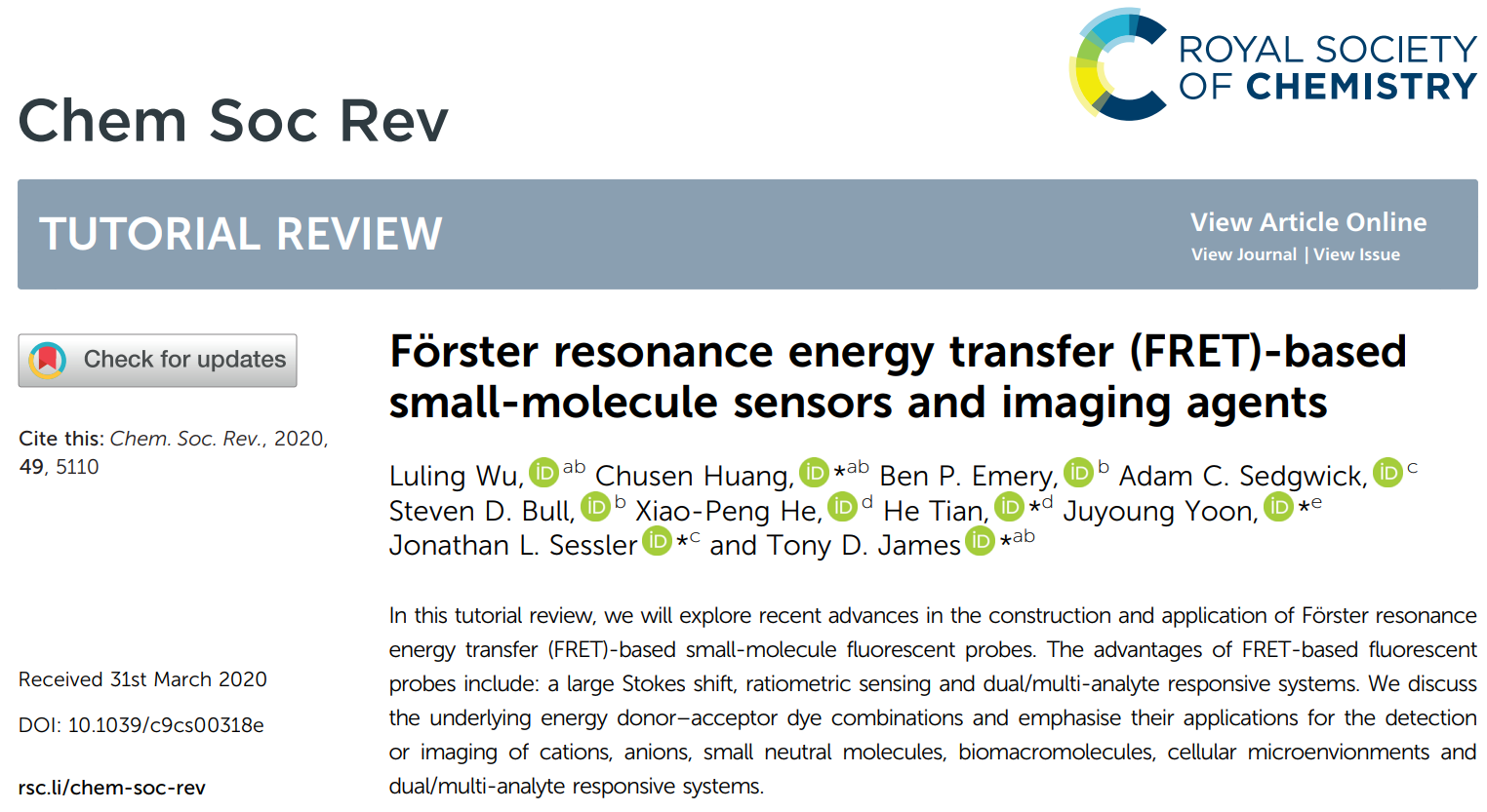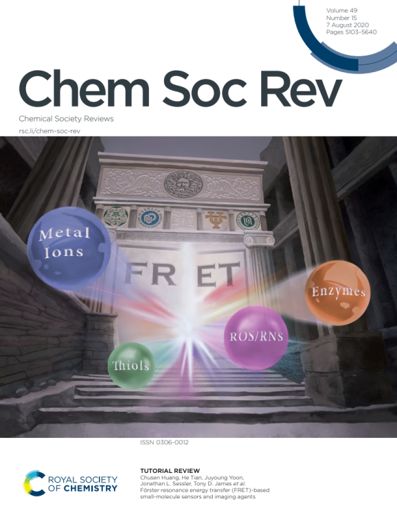 近期,米粒av 黄楚森副教授作为通讯作者的文章“Förster resonance energy transfer (FRET)-based small-molecule sensors and imaging agents”刊发于英国皇家化学会综述刊物Chemical Society Reviews《化学学会评论》(影响因子42.846),并被选为当期的正封面文章。