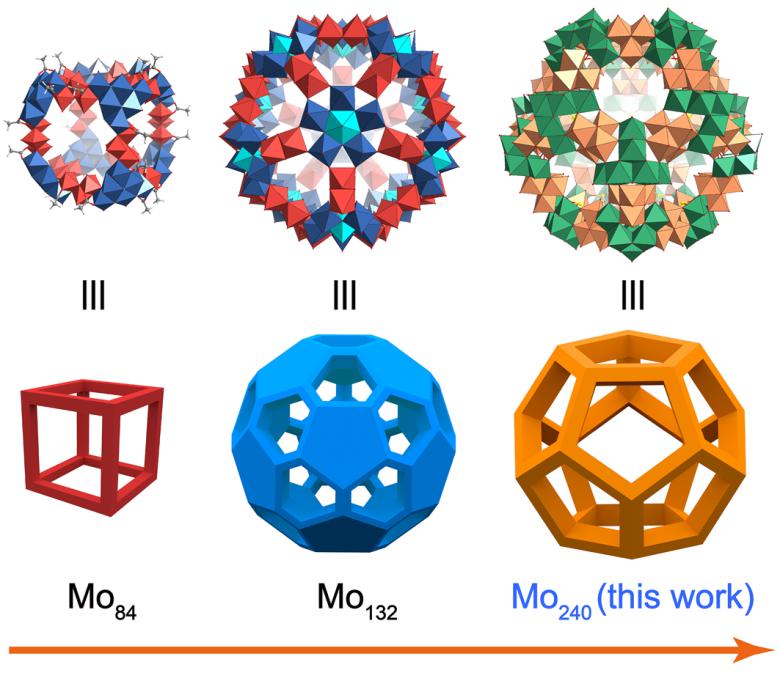 图1. 已报道的基于多钼酸盐的代表性高核中空巨型多面体笼Mo84和Mo132以及Mo240的结构和多面体几何形状。