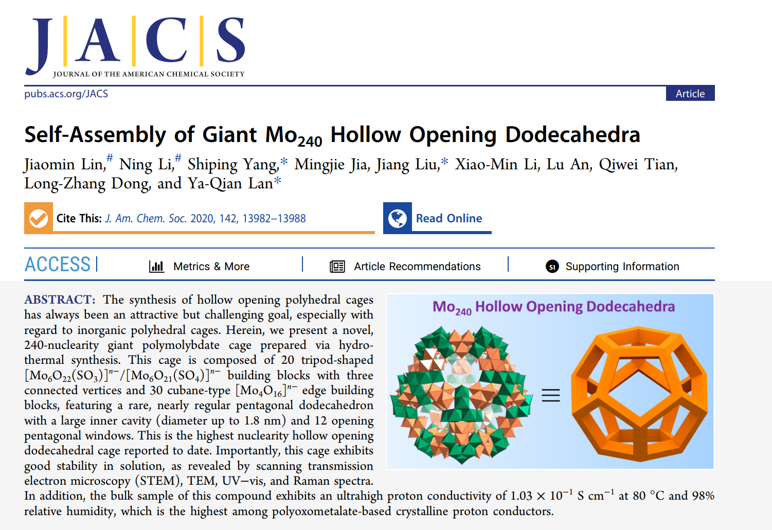 该论文报道了一例240核的巨型多钼酸盐笼(Mo240),其具有罕见的、几乎规则的五边形十二面体结构和非常大的中空敞开内腔(内径1.8 纳米),是目前报道的核数和对称性最高的中空敞开十二面体笼。此外,该化合物具有良好的结构稳定性,并且在高温高湿度下表现出优异的质子传导性能(1.03 × 10-1 S cm-1)。