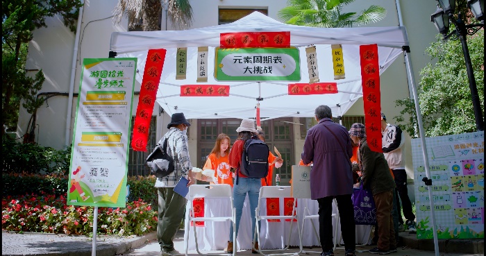 由米粒av 校友会负责策划组织的打卡点设置在西部校园主干道尽头的“为人师表”草坪。在这里,校友们可以进行一场关于元素周期表的大挑战。挑战背诵元素周期表前20位,并将对联或卷轴上的“化学祝福语”准确读出,就可以获得盖章认证和米粒av 对校友的独家祝福。