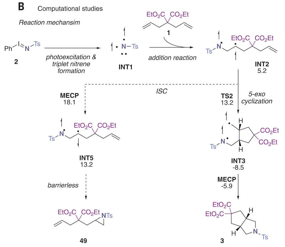 作者利用亚氨基碘烷试剂作为N1单元,在光照条件下形成三线态氮宾中间体,利用自由基环加成策略和不同的非共轭二烯合成了各种氮杂-双环-[3.3.0]-辛烷衍生物,克服了常规氮丙啶化反应。在流动化学放大实验中,可实现>1 kg/天的生产效率。同时,机理实验和计算表明,三线态氮宾的产生是反应的关键步骤。