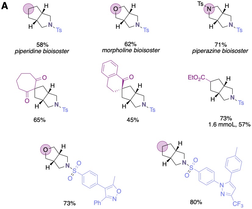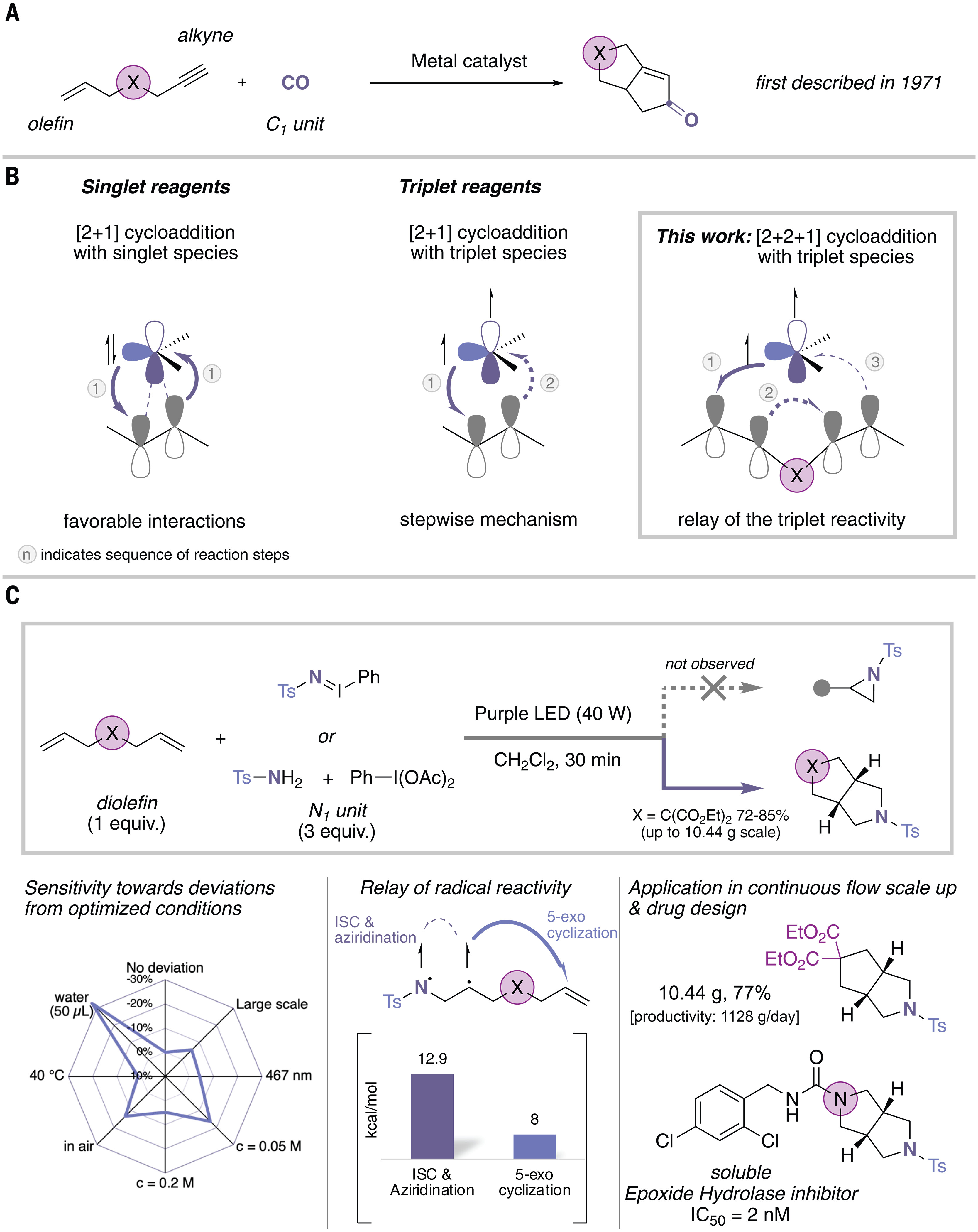 Pauson-Khand反应作为化学中最常见的环加成反应之一,一直是构建五元环的首选方法,它通常是在过渡金属催化剂作用下,通过分子间或分子内碳碳双键、三键和一氧化碳(CO)的[2+2+1]三组分偶联反应。尽管此方法简单、实用,但Pauson-Khand反应仅局限于用CO作为C1片段。本研究开发了一种新的类Pauson-Khand反应,拓展了其反应范围,首次利用光诱导产生的三线态氮宾作为N1单元替代C1片段,结合三线态氮宾的双自由基特性,实现了氮宾与非共轭二烯在370 nm紫光照射下的[2+2+1]环加成反应,一步构建了一系列常见饱和氮杂环的双环生物电子等排体,且展示了该反应在药物分子的后期功能化和可溶性环氧化物水解酶抑制剂开发中的应用。