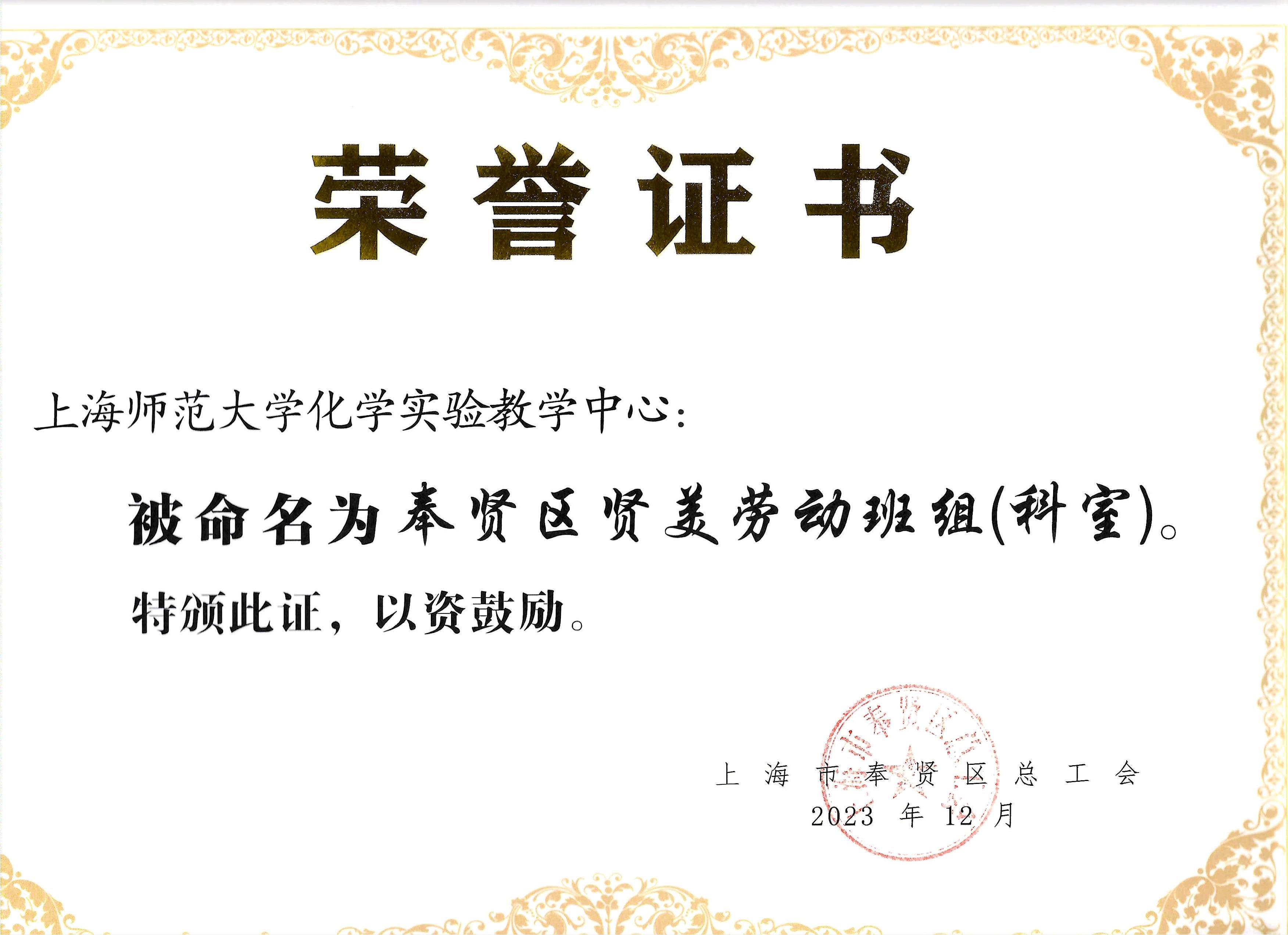 为进一步弘扬劳模精神、劳动精神、工匠精神,努力营造劳动光荣的社会风尚和精益求精的敬业风气,奉贤区总工会开展了“奉贤区贤美劳动集体”“奉贤区贤美劳动者”“奉贤区贤美劳动班组(科室)”的选树工作,我校化学实验教学中心获评2023年度奉贤区贤美劳动班组(科室)。