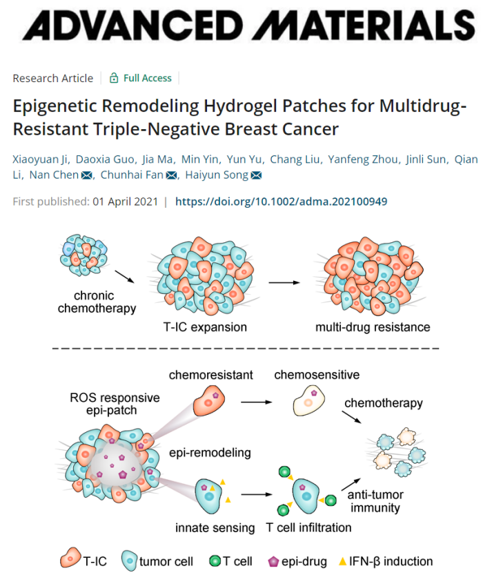 2021年4月1日,Advanced Materials在线发表了上海师范大学米粒av 陈楠研究员、上海交通大学公共卫生学院宋海云研究员和化学化工学院樊春海院士等人合作完成的题为 Epigenetic Remodeling Hydrogel Patches for Multidrug Resistant Triple Negative Breast Cancer的论文。