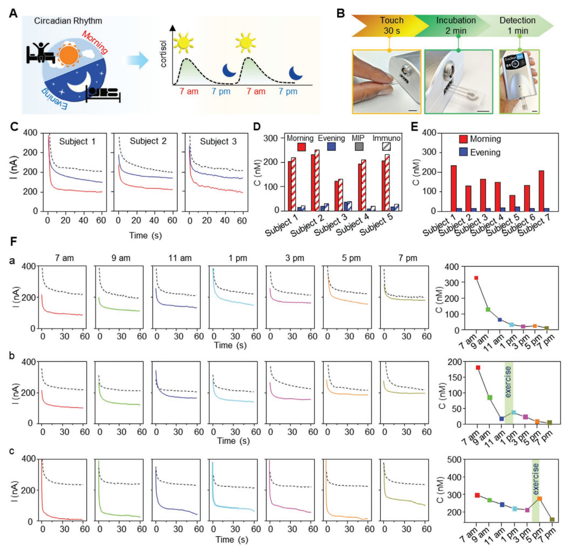 该组研究的皮质醇传感器的性能分别通过监测每天周期内内源性皮质醇水平的变化和皮质醇对急性物理刺激的反应来评估。(1)根据皮质醇水平与昼夜节律相关,早晨皮质醇浓度较高,白天下降,最后在晚上达到较低水平,通过半连续地动态跟踪人体皮质醇水平一天的变化来评估个人的慢性压力水平。该研究中将触摸式汗液皮质醇传感器与具有较好吸附性能的多孔水凝胶结合,在同一天时间内的早上7点和下午5点分别对5名志愿者的指尖汗液中皮质醇水平进行评估,并通过药物刺激排汗样本的免疫分析进行验证。