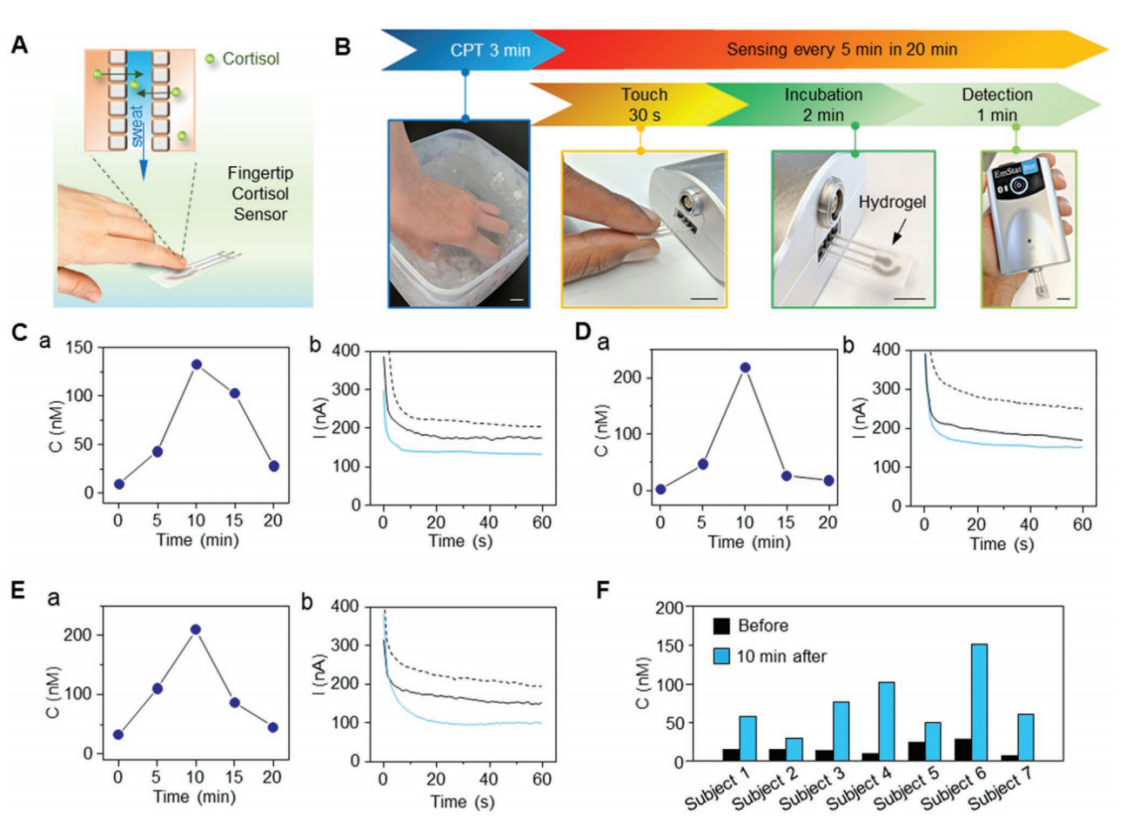 皮质醇是一种类固醇激素,存在于各种生物液体中,包括唾液、血液、尿液、汗液和细胞间液。由人体在应对心理和生理压力时释放,在机体的应激反应以及调节新陈代谢和免疫应答过程中起着重要作用。传统的皮质醇检测方法虽具备高灵敏度,但检测过程过于冗长、检测装置过于庞大而不具备可穿戴应用价值,同时还需要人体大量运动来收集汗液,这往往会扰乱体内皮质醇水平。美国加州大学圣地亚哥分校Joseph Wang课题组研发了一种新型无压皮质醇传感平台,可以通过指尖触摸快速而准确的检测人体汗液当中皮质醇含量。