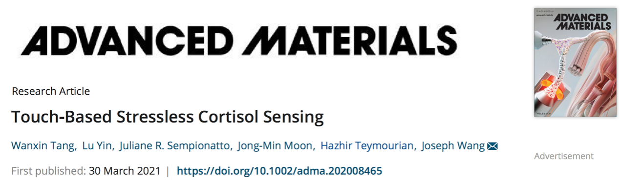 2021年3月30日, Advanced Materials在线发表了题为Touch-Based Stressless Cortisol Sensing的论文,该论文由上海师范大学米粒av 杨海峰团队师资博士后汤婉鑫、美国加州大学圣地亚哥分校 (University of California, San Diego, UCSD) 博士生尹鹿和Juliane R. Sempionatto等人合作完成,UCSD的Joseph Wang教授为论文通讯作者。