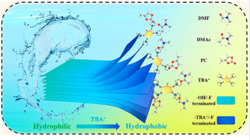 MXene是当前最热门的二维材料之一,但是,如何获得在有机溶剂中高度分散的MXene材料仍然是当前研究的一个巨大挑战。本论文报道了李辉教授课题组在高浓度MXene有机溶剂分散液方面取得的工作进展。文章详细地介绍了表面微环境修饰法(TMM)制备高浓度MXene有机溶剂分散液的方法,并对合成机理进行了深入探讨,同时该方案还完美地解决了MXene容易被氧化的问题。该论文为MXene材料的研究提供了一种高效的制备方法,有助于加速MXene材料的基础研究及实际应用。