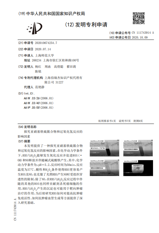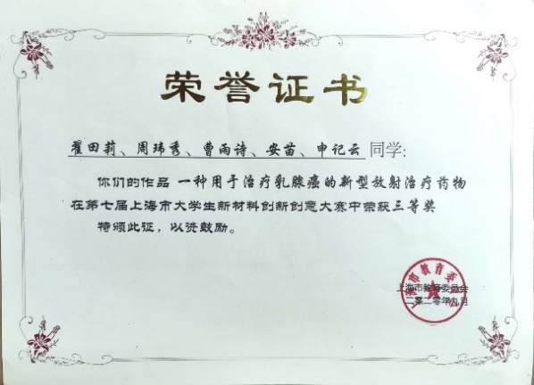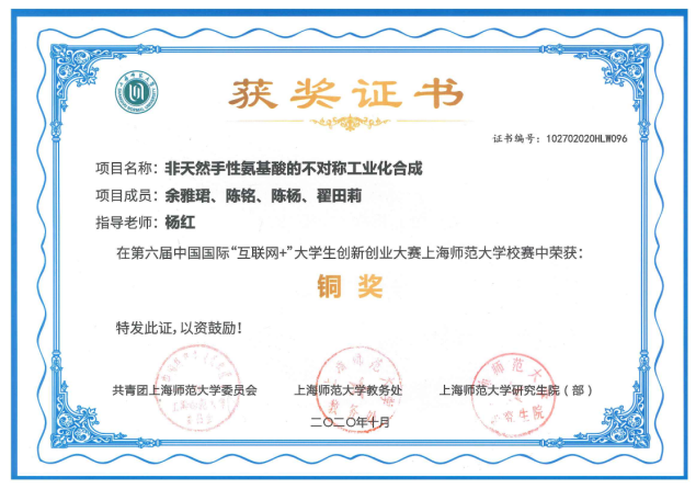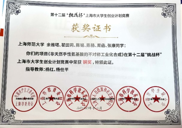 翟田莉,中共党员,2018级生物化工专业硕士生,曾任无机生化(研)党支部组织委员。师从杨红教授,研究方向为纳米生物学,读研期间完成学术论文4篇,其中SCIE期刊已发表论文2篇,另有两篇待发表,申请发明专利2项,主持完成上海师范大学一流研究生人才培育项目和上海师范大学学生科研项目各1项。先后获得研究生国家奖学金、学业一等奖学金,上海师范大学“优秀学生”、上海师范大学“三八红旗手”等荣誉称号,获得“华为杯”第十六届中国研究生数学建模竞赛全国三等奖,中国化学会优秀墙报奖,第七届上海市大学生新材料创新创意大赛市级三等奖,第十二届“挑战杯”大学生创业计划竞赛上海市铜奖、校级银奖,第六届中国国际互联网+大学生创新创业大赛校赛铜奖,第二届“慧源共享”全国高校开放数据创新研究大赛参赛奖等奖项。2021年,翟田莉同学获评“上海市优秀毕业生”。