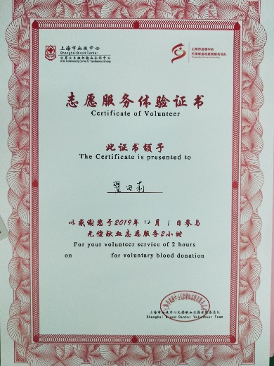 翟田莉同学始终坚持以爱心温暖他人,用奉献点亮青春。大学期间,她多次参与志愿服务工作,多次被评为“优秀志愿者”、“社会实践先进个人”。研究生期间,在学习科研之余,她也积极参加各种志愿服务活动,先后在上海市青少年科学创新实践工作站、上海市无偿献血志愿服务中担任志愿者,在化实服务中担任仪器讲解员,发挥学科优势,提供专业服务。她主动参加无偿献血2次,挽起袖子,为他人带来健康的希望,用爱心让生命之舟远航。
