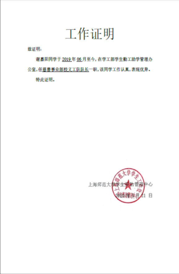在学生工作上,谢嘉阳同学曾任校级义工队队长。谢嘉阳同学建章立制,制定了学院义工队长的管理办法等5部管理方法,有效地促进了义工队的日常工作和管理制度化、规范化。此外,在义工项目的管理和发展上,谢嘉阳同学提出了“保障基数、丰富内容”的原则和思路。“保障基数”,一是指贫困生的基数,义工活动中贫困生必须要充分地参与进来,二是除去贫困生的基数之后,能兼顾或者在一定程度上满足非贫困生的义工需求。“丰富内容”,开设更多的有助于大学生实现自我价值的活动。