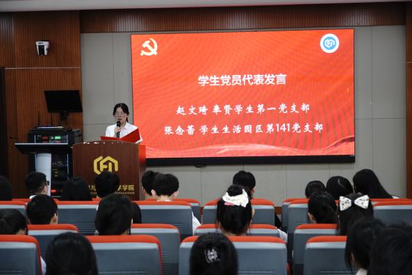 优秀大学生党员赵文琦和张念蕾作为学生党员代表进行发言。她们讲述了自己在师大学习生活的情况,表示在党组织的教育下,不断坚定理想信念,发挥先锋模范作用,今后会牢记入党初心,勤奋踏实工作,进一步成长为国家和社会的可用之才。