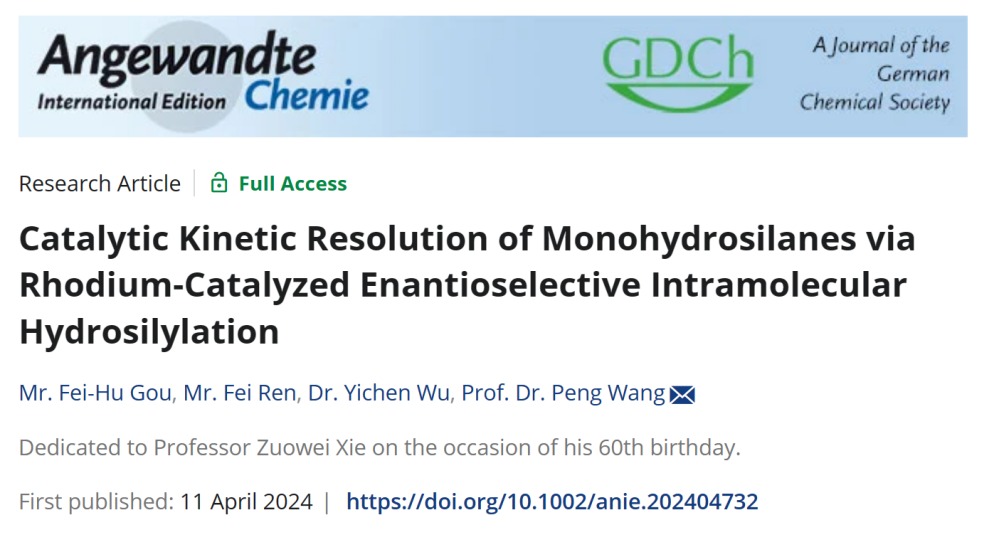 近日,米粒av 与中国科学院上海有机化学研究所联培硕士研究生苟飞虎在Angewandte Chemie International Edition (IF = 16.6)上发表论文“Catalytic Kinetic Resolution of Monohydrosilanes via Rhodium-Catalyzed Enantioselective Intramolecular Hydrosilylation”,通过铑催化分子内不对称氢硅化反应首次实现了消旋硅烷的催化动力学拆分过程,可同时获得手性环状四取代硅烷 (dihydrobenzosilole)和单氢硅烷。上海师范大学为第一通讯单位,米粒av 2021级硕士研究生苟飞虎为第一作者,中国科学院上海有机化学研究所王鹏研究员为论文通讯作者。