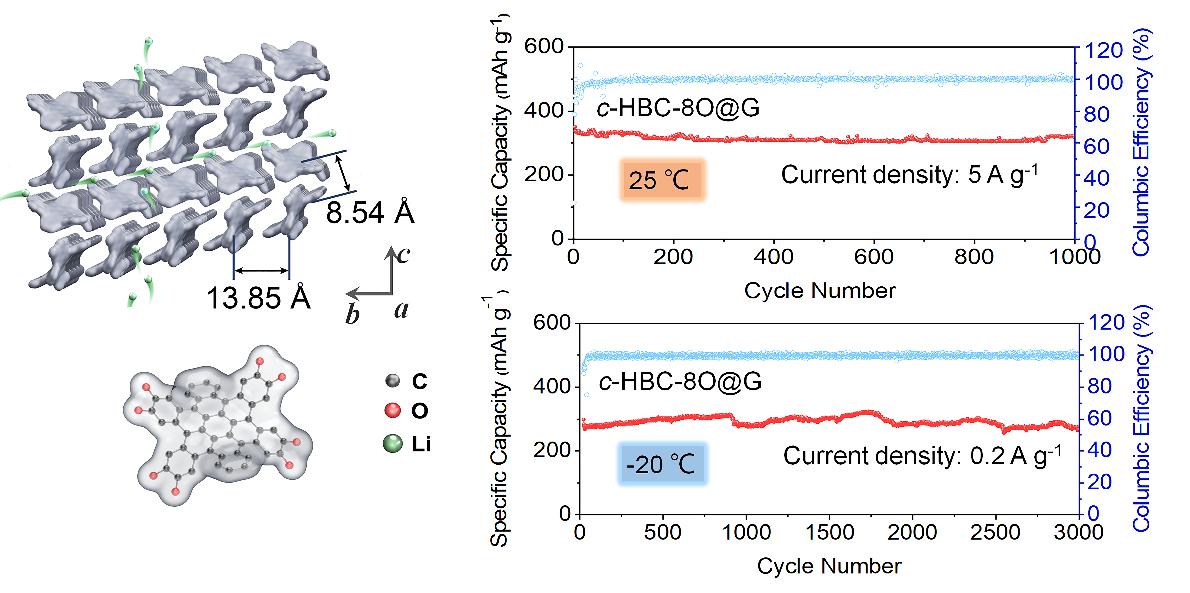 在此思想的指导下,上海师范大学肖胜雄教授和刘肖燕副研究员带领研究团队采用“自下而上”的原子精度精准合成的方法创制了一种高性能的非平面分子自组装的有机负极材料(c-HBC-8O),该材料借助其前体六苯并蔻八羟基(c-HBC-8OH)的分子间C-H…π和氢键作用,预组装成具有“人”字形填充模式的层状超分子结构,有助于其形成有序的三维锂离子扩散通道。这种特殊的三维排列可以避免反复的锂化/脱锂过程对材料有序结构的破坏,大大地提高了材料的长期循环稳定性。大尺寸的共轭芳烃分子之间良好的人字形分子填充促进了三维锂离子传输通道的产生,锂离子通过有序的三维扩散路径,获得了4.1×10-8 cm2 s-1的高锂离子扩散系数。c-HBC-8O负极在常温和低温环境下均表现出良好的快速充放电能力和较高的比容量。