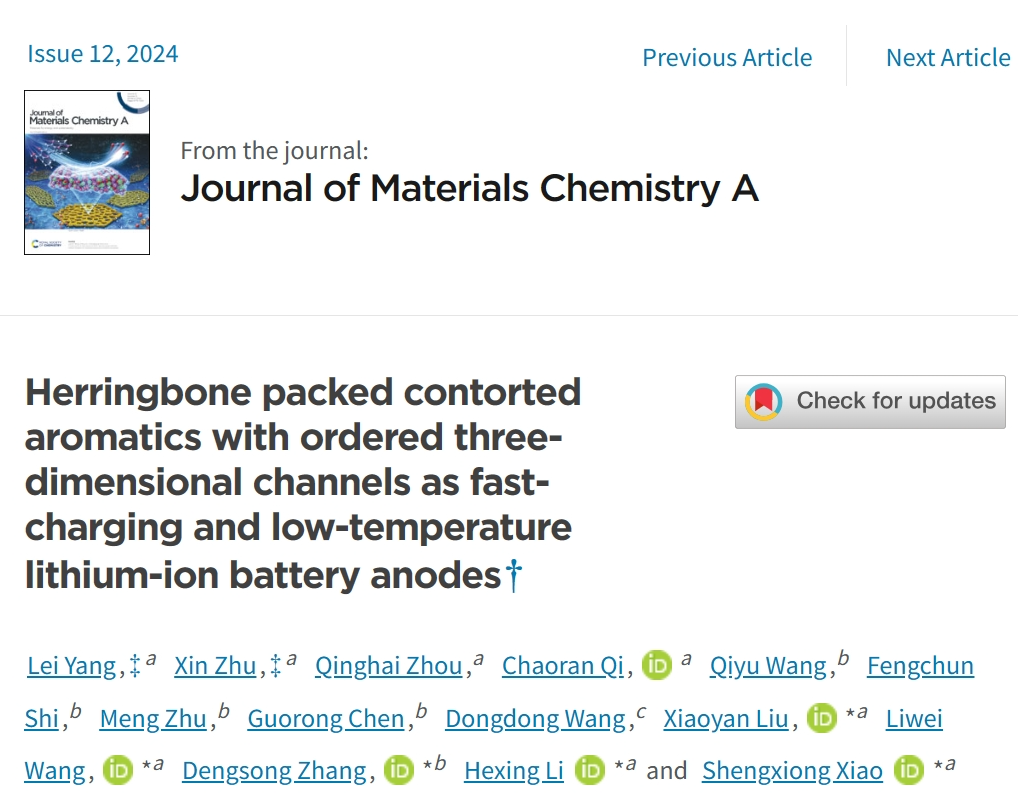 最近,学院肖胜雄教授和刘肖燕副研究员团队在锂离子电池快充及低温性能研究中取得重要进展,在《Journal of Materials Chemistry A》上发表题为“Herringbone packed contorted aromatics with ordered three-dimensional channels as fast-charging and low-temperature lithium-ion battery anodes”的研究论文。该研究采用“自下而上”的原子精度精准合成的方法创制了一种高性能的非平面分子自组装的有机负极材料(c-HBC-8O),以此制备的锂离子电池在常温和低温环境下均表现出良好的快速充放电能力和较高的比容量。