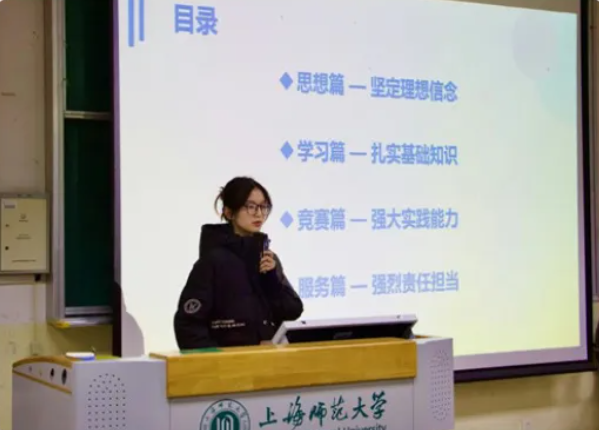 施泽怡的领导能力得到了广泛认可,在她的带领下,班级氛围积极向上,班级荣获上海师范大学十佳活力团支部。她积极参与“学习分享与答疑”的设岗定责相关工作,为低年级学弟学妹们提供学习分享和答疑服务,帮助他们规划生涯、参与竞赛和准备保研等方面提供宝贵经验。