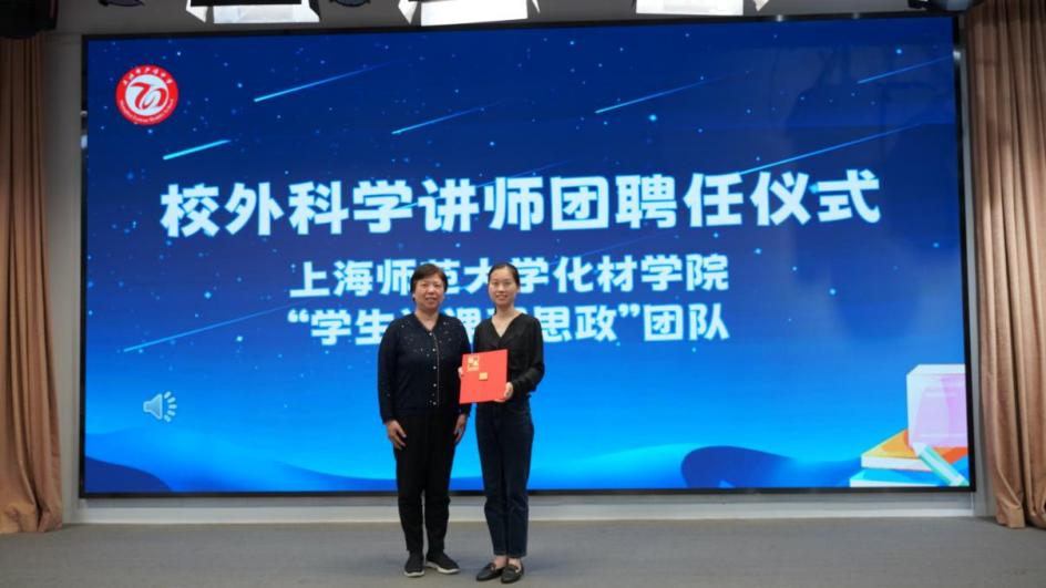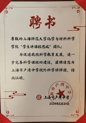 卢湾中学为化材学院“学生讲课程思政”团队颁发校外科学讲师团聘书,两校将共同用“活”化学课程思政资源,加强校际联动,助力化材学子在中学课堂中磨练师范技能,树立良好师德师风,站稳讲坛立德树人,也将助力卢湾学子进一步厚植爱国情怀,探索科学奥秘,增强科技报国的使命感。