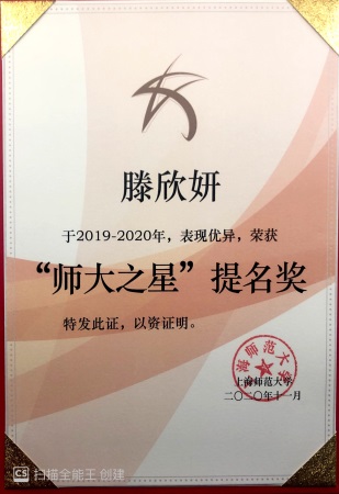 滕欣妍与上海师范大学的故事,要从2014年讲起。一个来自北方小城的姑娘拖着行李箱只身落地上海,这一来就是七年。本科期间,滕欣妍被上师大的科研氛围吸引,并有幸结识杨海峰教授,最终在本科毕业后进入杨老师课题组攻读分析化学硕士研究生。滕欣妍总是说,感觉自己很幸运,能选择到优秀的导师,能在研究生期间参加各种各样的活动。