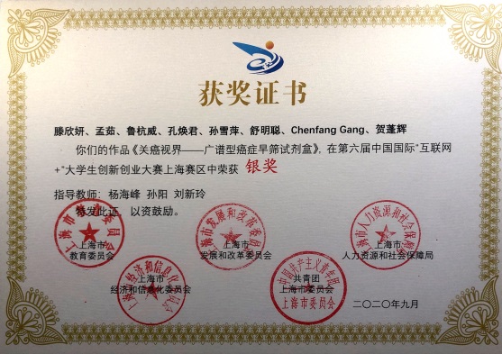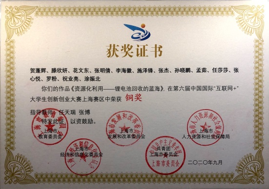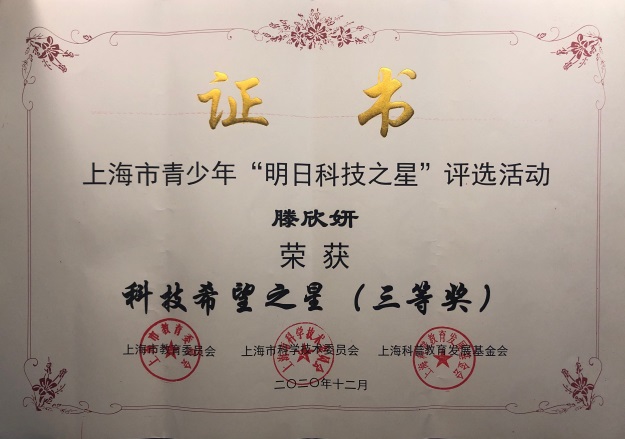 于是,滕欣妍与团队成员一起,在疫情期间报名参赛,最终斩获第六届中国国际“互联网+”大学生创新创业大赛上海赛区银奖、铜奖,第七届上海市大学生新材料创新创意大赛二等奖、第十二届“挑战杯”上海市大学生创业计划竞赛铜奖,第十八届上海市百万青少年争创“明日科技之星”评选活动暨上汽教育杯上海市高校学生科技创新作品展示评优三等奖等成绩。