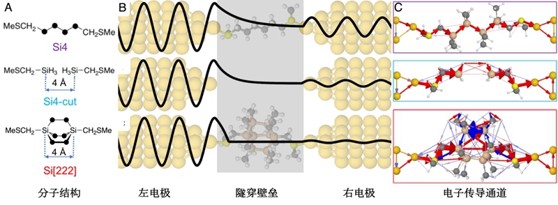 图示电子在硅单分子导线中隧穿时的波函数衰减情况及电子传导情况:A)直链硅烷分子线Si4、模拟真空缝隙硅分子线Si4-cut和桥环硅烷分子线Si[222]三种分子的结构示意图;B)三种分子导线在电子隧穿过程中的波函数衰减示意图;C)分子导线中的电子传导通道示意图,箭头的粗细与电子传导元素的强度成正比,而箭头颜色则代表传输方向,红色箭头表示有效的电子传导,蓝色箭头表示破坏性的量子干涉。