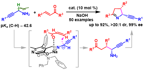 赵宝国教授与陈雯雯教授团队利用一种具有苯-吡啶联芳基骨架与大位阻酰胺侧链的新型吡哆醛作为羰基催化剂,成功实现了N-未保护的炔丙胺对α,β-不饱和酮的首次对映选择性α-C–H共轭加成,随后共轭加成产物经过原位分子内缩合,以良好的收率和优秀的立体选择性高效构建了一系列手性多取代1-吡咯啉衍生物。该研究展示了仿生羰基催化剂在惰性C–H键不对称官能化中的强大作用,大大拓展了羰基催化的适用范围。