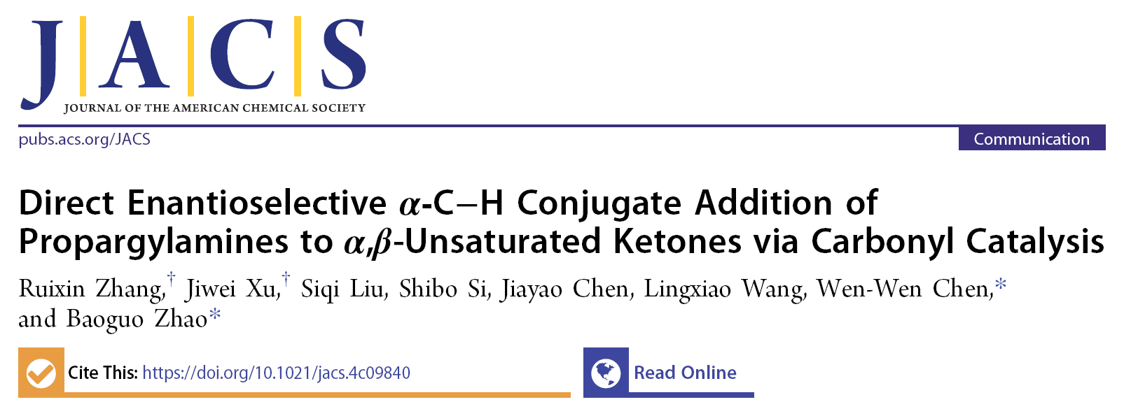 近日,米粒av 赵宝国教授和陈雯雯教授团队在仿生羰基催化惰性伯胺α C–H键不对称官能团化研究中取得进展,相关成果以 “Direct Enantioselective α-C–H Conjugate Addition of Propargylamines to α,β-Unsaturated Ketones via Carbonyl Catalysis”为题发表在《Journal of American Chemical Society》上。上海师范大学为唯一署名单位,20级硕士生张瑞鑫和徐吉伟为论文共同第一作者,赵宝国教授和陈雯雯教授为论文共同通讯作者。