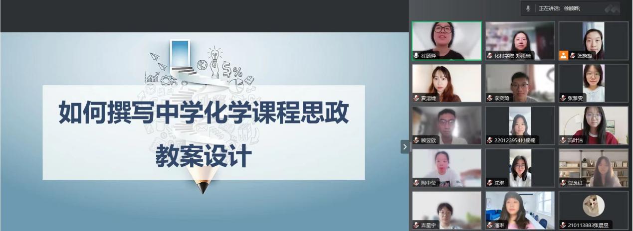 郑雨晴老师从教学内容分析、学情分析、教学目标、教学重难点、教学与评价思路、教学流程、教学详细过程各方面为学生讲师展示了中学化学课程思政的教案设计。郑老师从一线中学化学教师的角度强调了教案设计的重难点,例如:教学目标的设定要参考课程标准,确保教学的科学性和有效性;学情分析要涵盖已知点、障碍点和发展点,使教学更具针对性;在教学内容分析中要注重教材内容的位置、地位、承前启后作用;教学流程的常规思路等等。作为“学生讲课程思政”第二季的讲师,郑老师也展示了自己的课程思政片段,从二氧化硫造成酸雨的讨论引出党和国家对于生态保护的重视,带领学生循着党和国家的脚步,从课堂走入生活,解决酸雨问题,培养学生可持续发展的意识。郑雨晴老师为中学化学课程思政教案设计提供了具体的方法和思路,有助于学生讲师将课程思政更好地融入教学实践中。