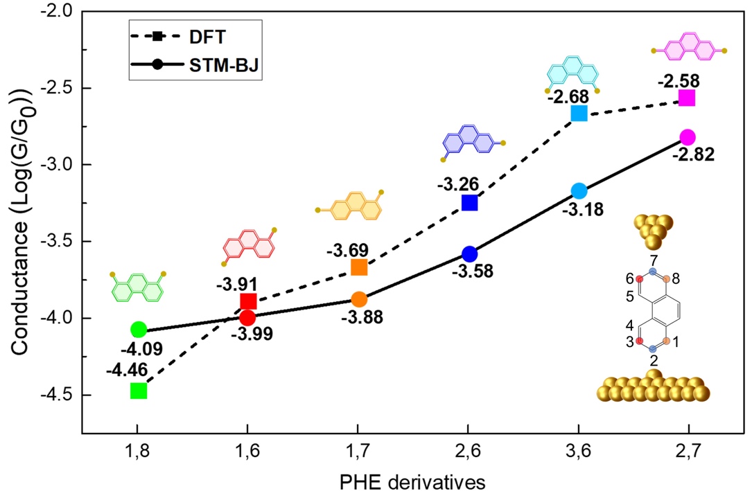 单分子电子学能够将化学、物理学、工程学和电子学的专业知识融汇在一起,实现电子器件的微型化,有望解决传统半导体器件由于在尺寸缩微化过程中所遇到的理论及技术难题,为后摩尔时代芯片的研发提供支撑。如何成功构建稳定的单分子器件以及如何进行分子尺度的性能调控是实现上述目标的关键步骤。肖胜雄教授团队通过在不同位置修饰上二硫甲基作为锚定基团,获得了六种菲衍生物(最小的扶手椅型石墨烯纳米带),并借助扫描隧道显微镜断裂连结技术,测定了上述分子导线在金电极间的单分子电导,发现通过连接在不同位置,菲分子导线的电导差异可以高达20倍,实现了对分子导线电导的有效调控(图1)。