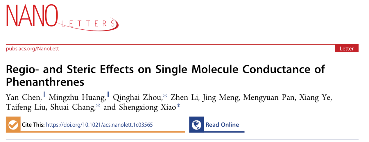 12月7日,资源化学教育部重点实验室肖胜雄教授团队在单分子电子学研究领域取得新的进展,相关成果在国际期刊《Nano Letters》上发表,论文题目为“Regio- and Steric Effects on Single Molecule Conductance of Phenanthrenes”。上海师范大学为第一署名单位,论文第一作者为我校博士生陈艳以及武汉科技大学黄明柱,论文共同通讯作者为米粒av 肖胜雄教授、周庆海副研究员和来自论文第二通讯单位武汉科技大学的常帅教授。
