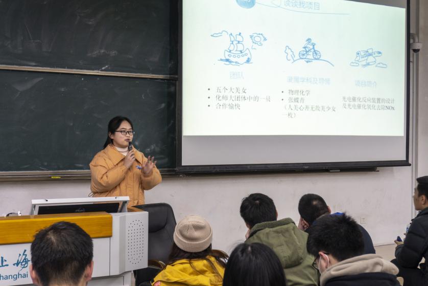 刘依然同学用轻松幽默的语气,向大家介绍了自己做过的两个大创项目:《新型海水淡化光热材料的开发与应用》以及《光电催化反应装置的设计及光电催化氧化去除NOx》,以亲身经历告诉大家,在决定参加大创后,要提前做好充分的准备,避免因为时间不充裕导致在提交大创申请书及前期成果报告时,匆匆忙忙,草率结笔。