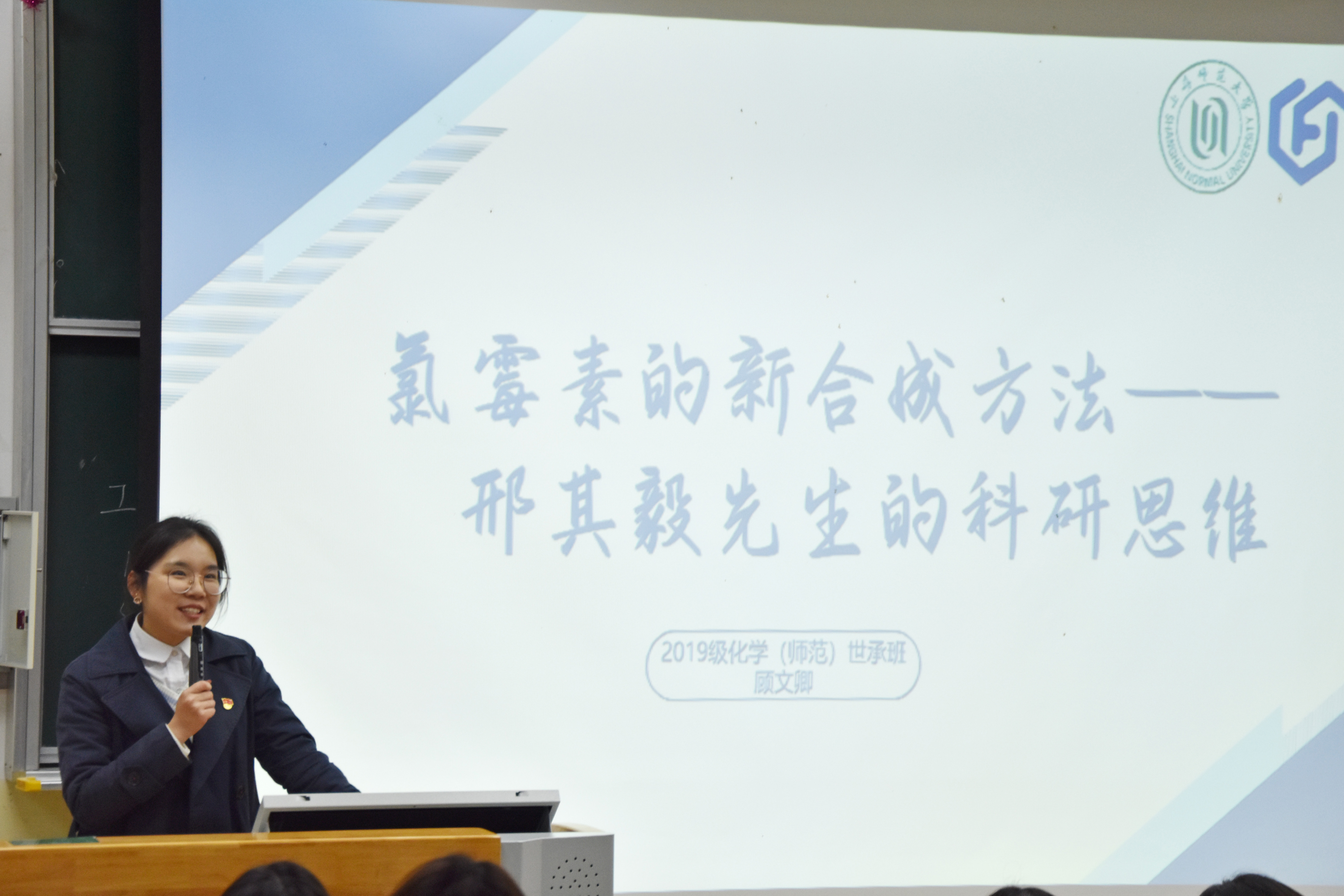 张娓娓由《高分子学报》上刊登的《荃意江南 芬芳高分子》一文,引入沈之荃教授及其提出的“三元镍系催化体系对丁二烯的定向聚合和镍顺丁橡胶的结构性能”的研究课题。张娓娓为同学们介绍了三元镍系顺丁橡胶的合成机理和合成的工艺过程,讲述了沈之荃教授在寻找镍系催化体系制备顺丁橡胶过程中遇到的困难及解决方法,以及三元镍系顺丁橡胶的工艺合成过程和应用,引导同学们学习沈之荃教授全情科研的科学精神,感受科学前辈从事科研工作时不畏艰难、严谨细致的优良作风。