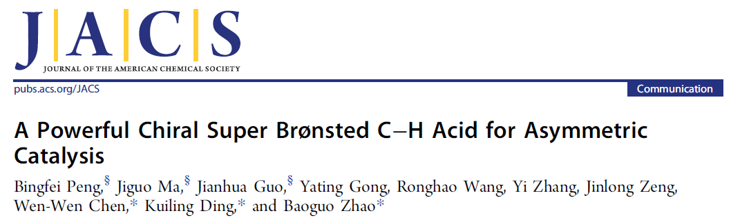 2月10日,上海市仿生催化前沿科学研究基地(培育)的赵宝国教授、陈雯雯副研究员团队和中国科学院上海有机化学研究所丁奎岭院士团队联合发展了一类具有超强酸性的新型手性Brønsted碳酸,相关成果以“A Powerful Chiral Super Brønsted C–H Acid for Asymmetric Catalysis”为题发表在《Journal of American Chemical Society》上。21级博士生彭兵飞、上海师范大学和上海有机化学研究所联合培养的16级硕士生马继国和19级硕士生郭建华为论文共同第一作者,上海师范大学赵宝国教授、陈雯雯副研究员、上海有机化学研究所丁奎岭院士为论文共同通讯作者。