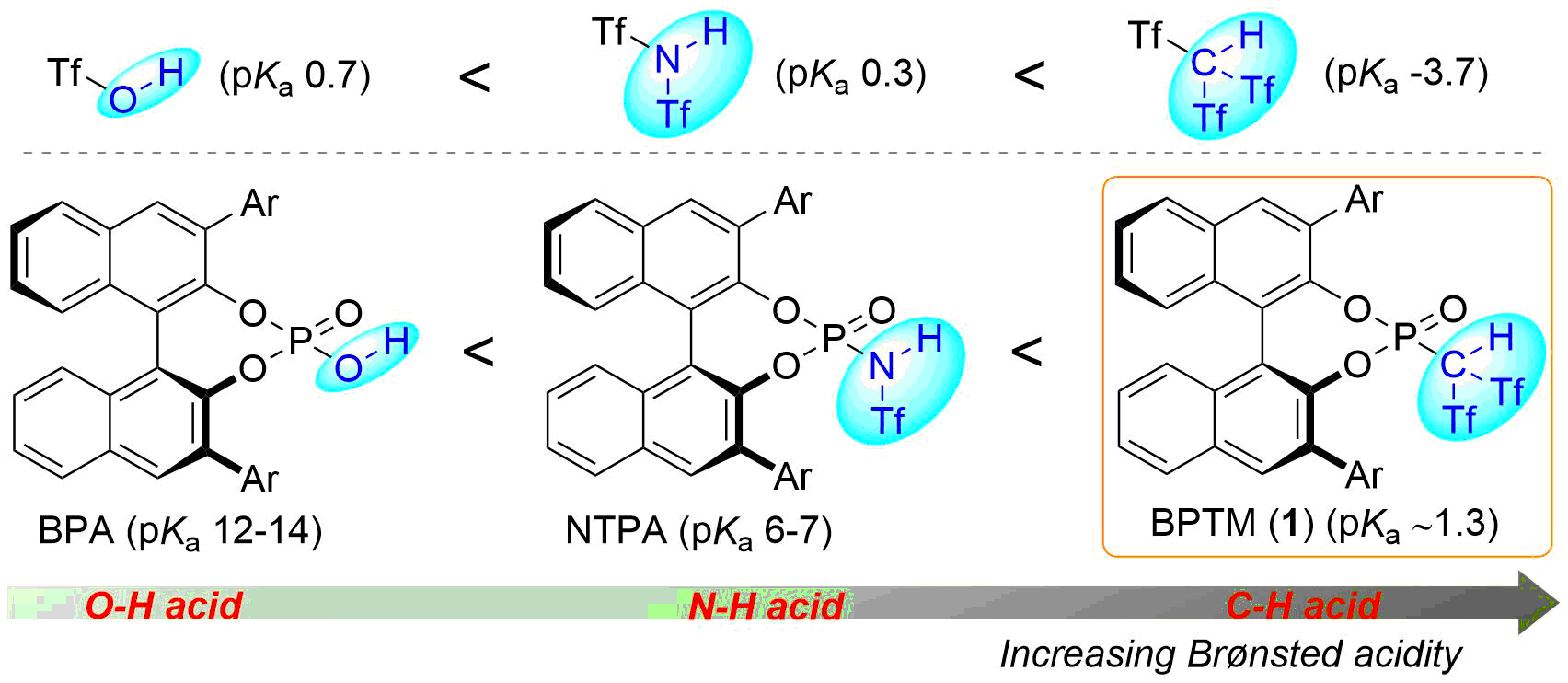手性Brønsted酸是一类重要的有机催化剂,可以有效地实现许多对映选择性构建碳-碳键和碳-杂键的反应。酸性在不对称Brønsted酸催化中至关重要,一般来说,酸性越强,反应活性越高。迄今为止,手性Brønsted超强酸报道非常有限,发展新型手性Brønsted超强酸催化剂具有重要意义。赵宝国教授、陈雯雯副研究员团队和中国科学院上海有机化学研究所丁奎岭院士团队联合发展了一类具有超强酸性的新型手性Brønsted碳酸(BPTM),并成功将其应用于多种不对称反应中,均表现出极高的催化活性和优秀的立体选择性,其高催化活性来源于BPTM的超强Brønsted酸性。该研究所发展的超强Brønsted酸催化剂BPTM有望实现挑战性的不对称转化,丰富和拓展不对称Brønsted酸催化化学。