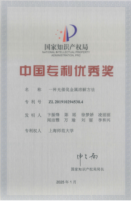 目前,该团队围绕“贵金属的光催化清洁提取”累计申请国内发明专利15项,授权5项,申请2项PCT,并在欧美、日本等贵金属回收技术发展前景较好的国家/地区开展布局,已就该核心专利“一种光催化金属溶解方法”获得日本、美国、欧洲同族专利授权,形成了具有自主知识产权的“专利池”。同时,该核心专利曾荣获第三十六届上海市优秀发明选拔赛金奖,第四届上海知识产权创新奖,入围上海市首届高价值专利运营大赛百强,配套中试装置荣获第二十三届中国国际工业博览会高校展区优秀展品奖等多个奖项;卞振锋教授荣获第十四届发明创业奖人物奖和第四届海聚英才全球创新创业大赛优胜奖等相关奖励。