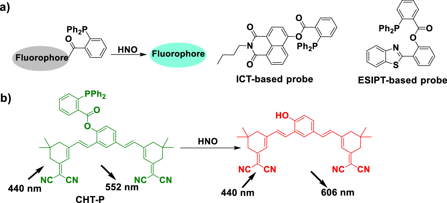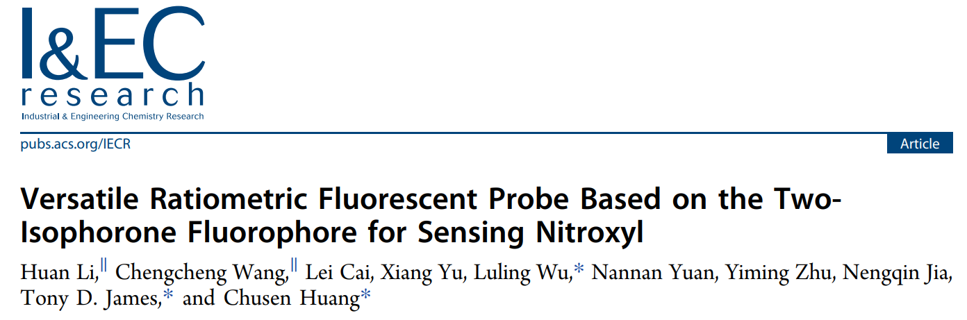 近日,学院黄楚森/贾能勤团队与英国巴斯大学Tony D. James/吴庐陵团队合作,在《Industrial & Engineering Chemistry Research》上发表了题为“Versatile Ratiometric Fluorescent Probe Based on the Two-Isophorone Fluorophore for Sensing Nitroxyl”的研究论文。作者通过将两个异佛尔酮结构共轭修饰在一个染料分子上,创制双异佛尔酮荧光染料母体。发现该染料分子具有特别的双通道荧光信号输出。作者基于此双异佛尔酮荧光染料母体构建了能实现比值型检测次硝酸(HNO)的探针分子。由于HNO的特异性响应基团2-(二苯基膦基)-苯甲酸酯具有较强的荧光淬灭特性,导致目前大多数基于此基团设计的探针分子在检测HNO时候的信号很难表现出较好的比值型特征。而基于双异佛尔酮荧光染料的探针分子在识别HNO前后表现出明显的单激发双发射特征,在活细胞成像和试纸条上都能实现对于HNO的比值型检测,更有利于在定量检测HNO时增强信号的稳定性。该双异佛尔酮染料母体的发现,也为比值型荧光探针的设计提供了一种全新的染料母体结构和设计思路。