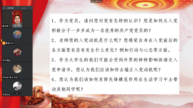同时,荣誉班导师全员参与入党积极分子培训班,深入到各小组中,和同学们分享自己的入党历程,交流了入党动机、入党经历、对党的认识,和同学们一同探讨如何发挥党员先锋模范作用等问题。他们也对入党积极分子提出期望,希望他们在目前疫情状态下,要以高标准来要求自己,积极投身到抗疫的志愿活动中,发挥先锋模范作用,为同学们服务。