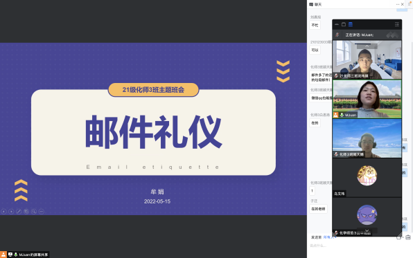牟娟老师带来了一场邮件礼仪的主题班会。她从应用场合、邮件写作、邮件发送和邮件回复四个方面,为化师3班同学讲述了写电子邮件时需要注意的邮件礼仪问题,也让同学们认识到写好一封电子邮件看似简单但实则暗藏学问。