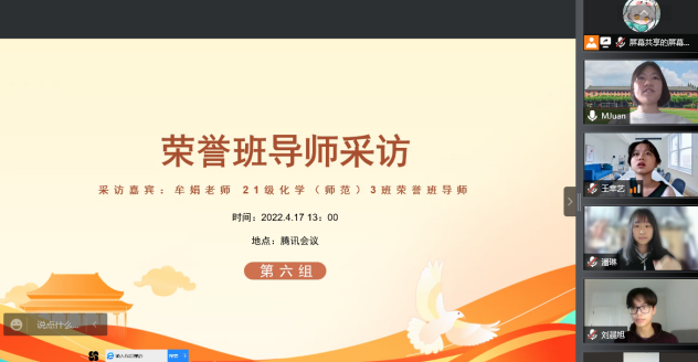谭春霞老师邀请了香港城市大学博士后储丹丹老师和在读研究生朱元利,为化师4班同学带来学习、科研和工作经历的分享。通过交流分享,同学们进一步认识到要向优秀的老师、学姐看齐,不能因为线上学习就有所懈怠。谭春霞老师还邀请刘锐副研究员为班级同学带来科普讲座“生活中无处不在的手性”,并组织同学观看微电影《有机师姐》,让同学们了解了科研是什么、有什么意义,激发同学们对科研的兴趣。