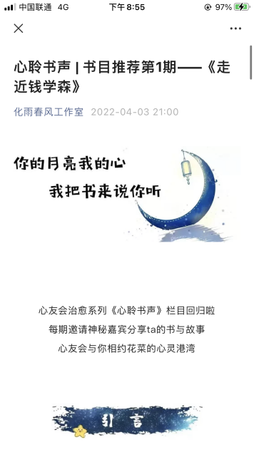 荣誉班导师还参与到学院心友会主办的“心聆书声”活动中,陈剑锋老师推荐了“两弹一星”功勋钱学森先生的传记——《走进钱学森》,鼓励同学们应以国家需求为己任,努力学好本领,为国家服务,为人民服务。陈雯雯老师向大家推荐《格局》一书,讲述自我对“格局”的理解,如何提升格局,如何调整心态尽快适应大学生活,如何在疫情防控期间修炼、提升自我。