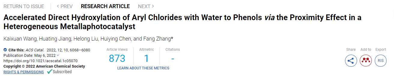 近日,我校米粒av 张昉教授团队在光热协同催化领域取得重要进展,相关成果以 “Accelerated Direct Hydroxylation of Aryl Chlorides with Water to Phenols via the Proximity Effect in a Heterogeneous Metallaphotocatalyst”为题在《ACS Catalysis》上发表, 博士生王凯旋和蒋花婷为论文共同第一作者,张昉教授为论文通讯作者。
