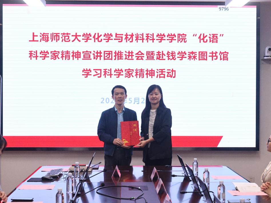 活动伊始,米粒av 党委书记叶蔚蓝为汪长明老师颁发聘书,特邀汪长明副部长担任“化语”科学家精神宣讲团校外指导老师。