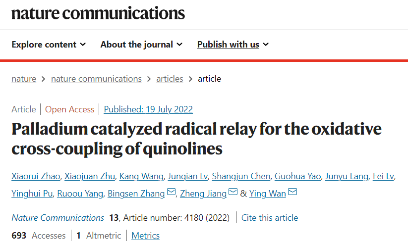近日,我校米粒av 万颖教授团队在Nature子刊《Nature Communications》上发表论文 “Palladium catalyzed radical relay for the oxidative cross-coupling of quinolines”,钯催化自由基接力实现喹啉高效氧化交叉偶联反应。上海师范大学为第一署名单位,17级博士生赵小瑞、学院青年教师朱小娟为论文共同第一作者,上海师范大学万颖教授、中国科学院上海高等研究院姜政研究员,中国科学院金属研究所张炳森研究员为论文共同通讯作者。