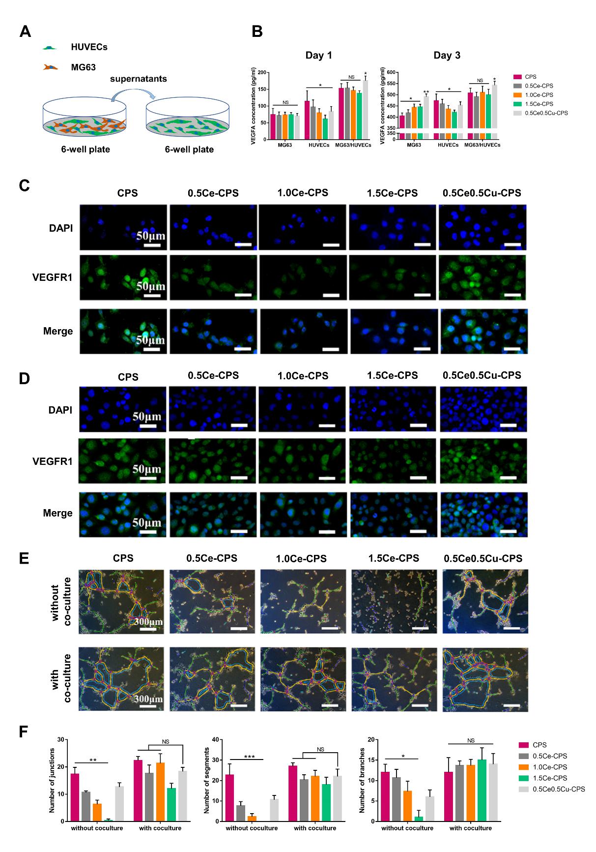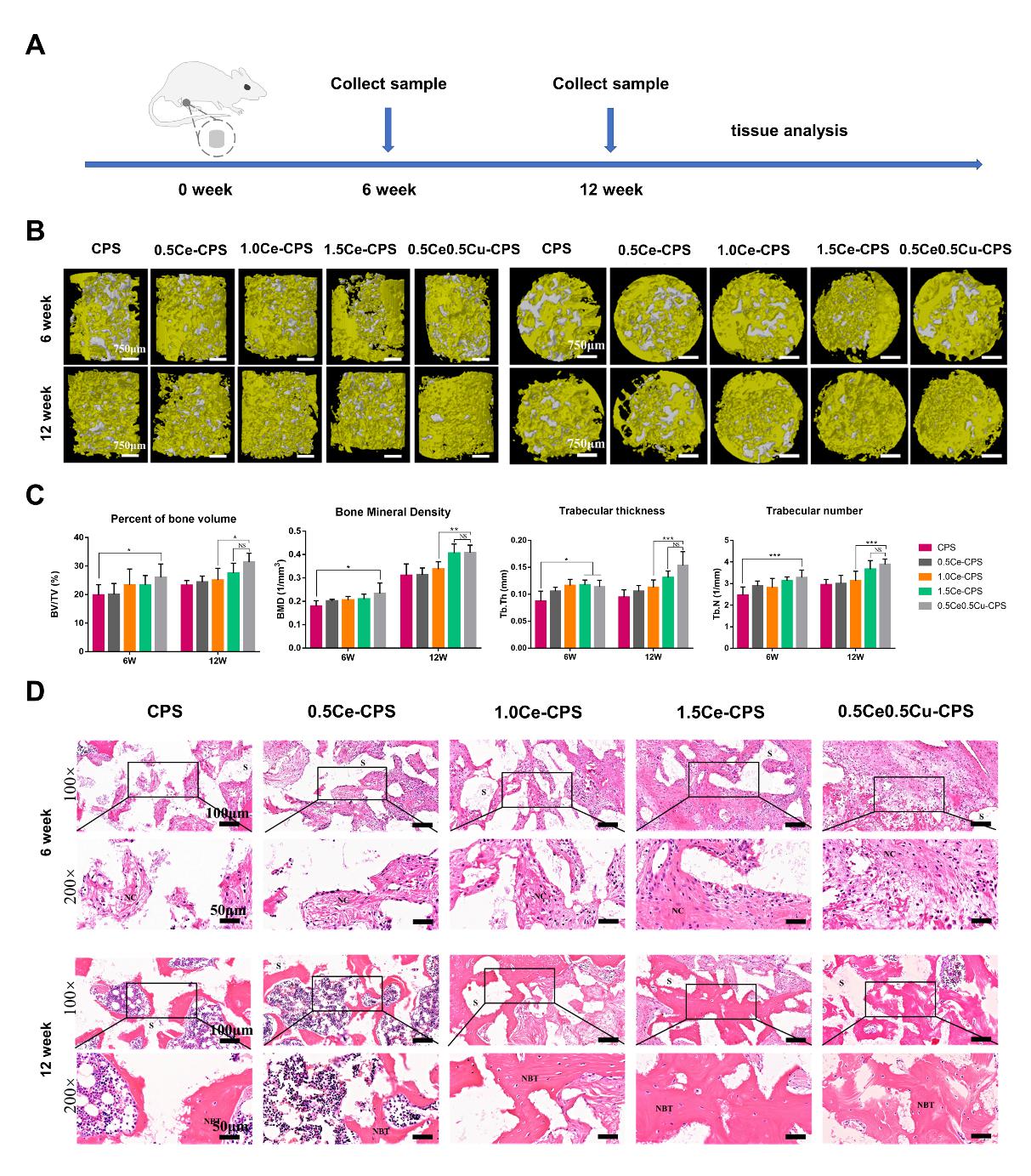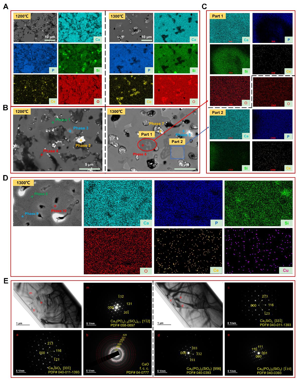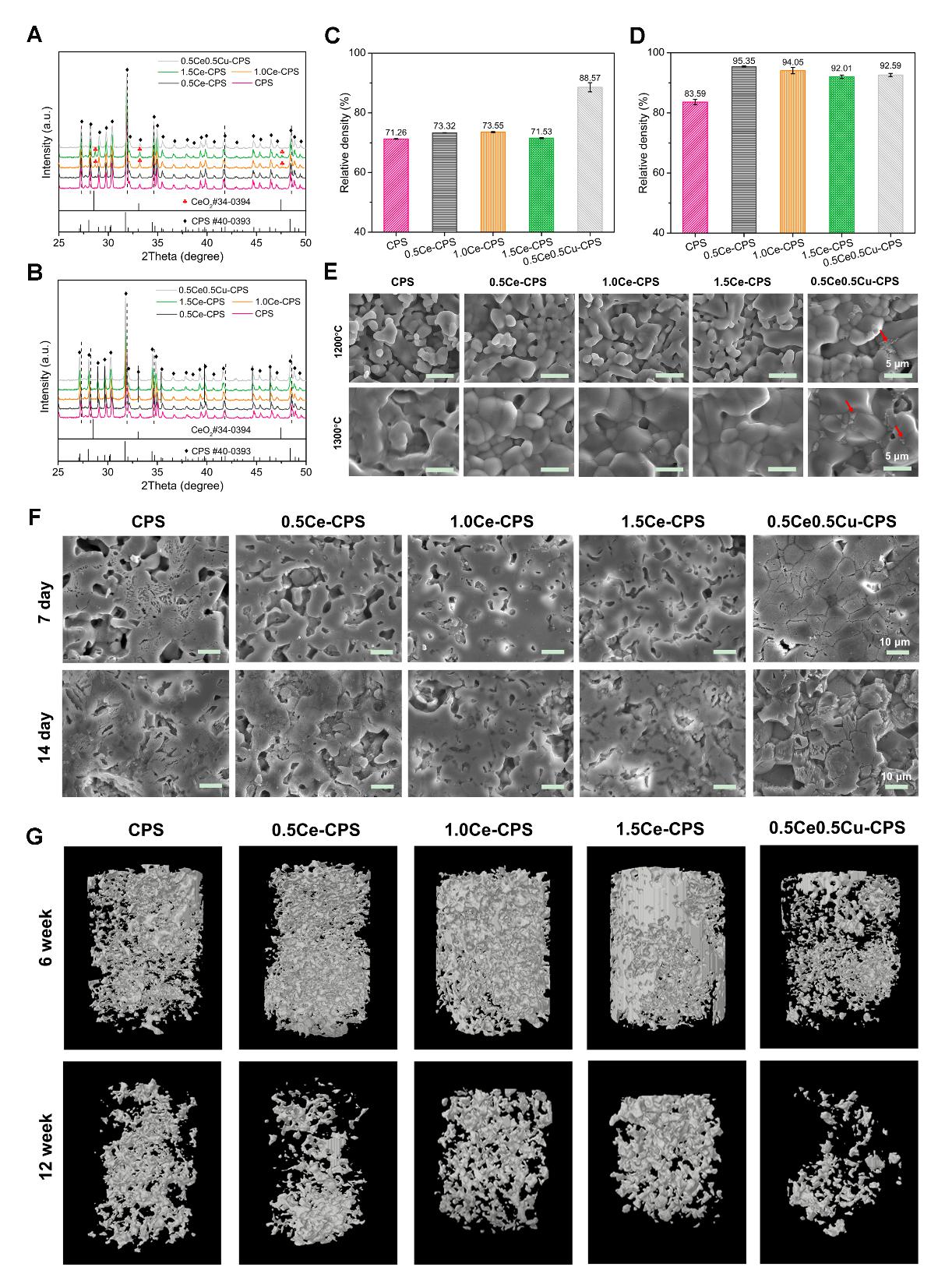 本研究中,作者利用生物功能性元素铈 (Ce)和铜 (Cu)协同调节硅磷酸钙生物陶瓷 (Ca5(PO4)2SiO4, CPS)的物相组成和微观结构,对其降解性、生物活性和生物安全性进行了深入研究。