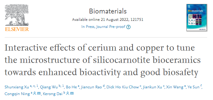 [1] Shunxiang Xu†, Qiang Wu†, Bo He, Jiancun Rao, Dick Ho Kiu Chow, Jiankun Xu, Xin Wang, Ye Sun, Congqin Ning*, Kerong Dai*. Interactive effects of cerium and copper to tune the microstructure of silicocarnotite bioceramics towards enhanced bioactivity and good biosafety. Biomaterials, available online 21 August 2022, 121751. //www.sciencedirect.com/science/article/pii/S014296122200391X