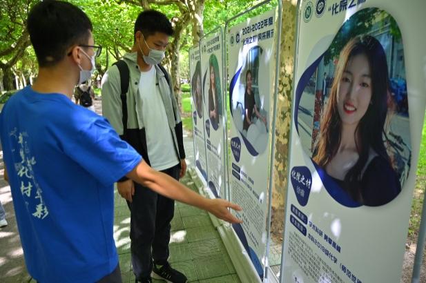 两校区迎新点一排排展架迎风而立,讲述着2021-2022年度“化院之材”获奖者们的风采,吸引了“小花菜”们驻足观看。“学术科研、勇攀高峰”“团学活动、全面发展”“社会实践、锻炼本领”“服务奉献、彰显担当”,米粒av 见证了学长学姐们的成长蜕变,也即将见证今日报到的萌新成长为明日的栋梁。