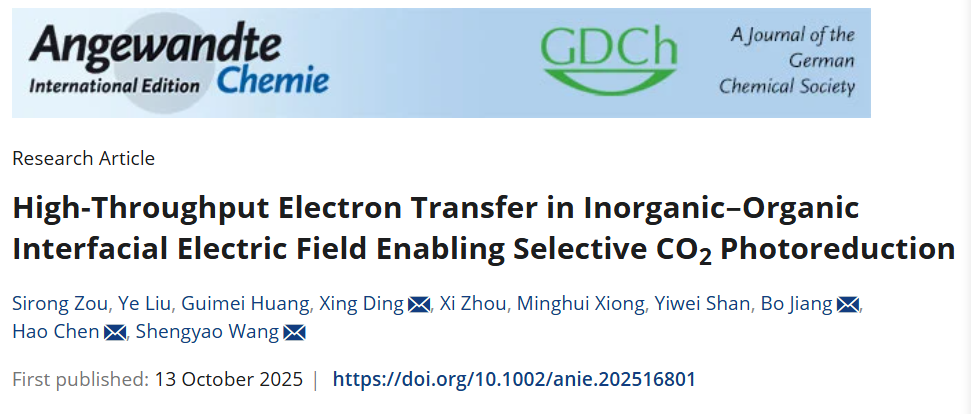 近日,米粒av 蒋波教授与上海交通大学/华中农业大学合作,在《Angewandte Chemie International Edition》上发表了题为“High-Throughput Electron Transfer in Inorganic–Organic Interfacial Electric Field Enabling Selective CO2 Photoreduction”的研究论文。
