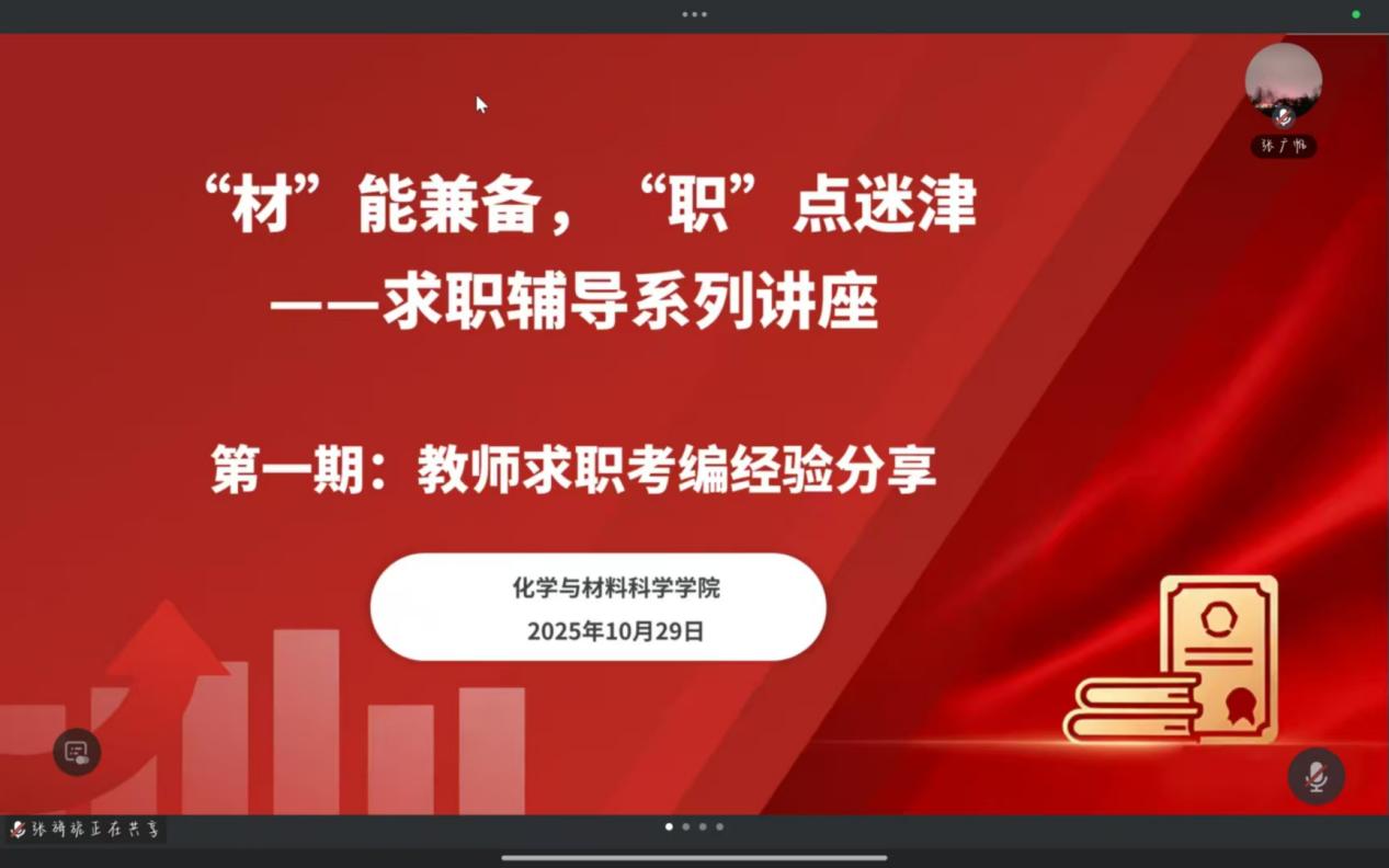 目前,首期“教师考编求职经验分享”专场已圆满落幕。本次分享会邀请到两位担任中学化学教师的优秀校友,分别结合自身求职与任职经历拆解考编要点。活动通过腾讯会议线上开展,吸引众多学子参与。