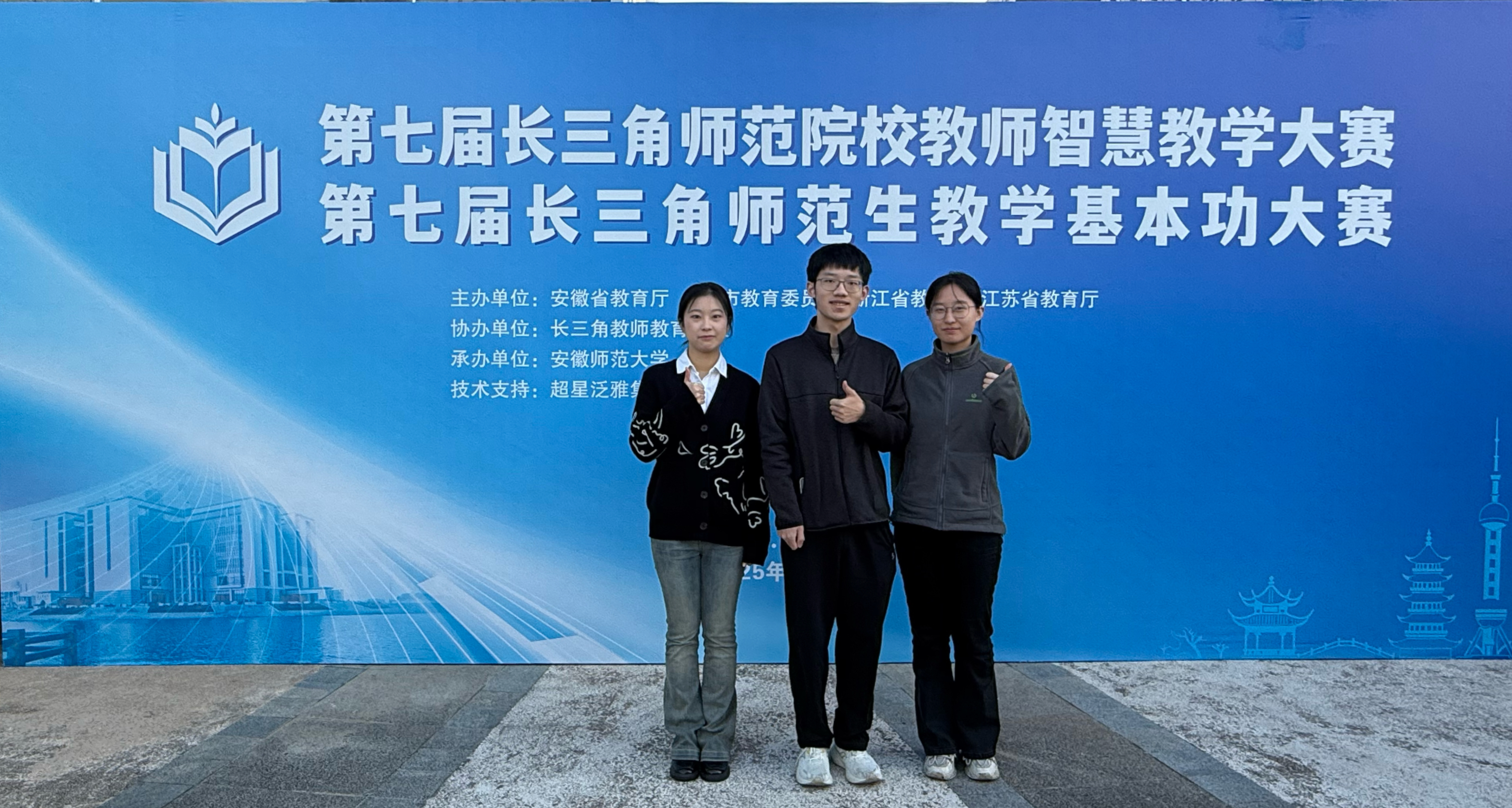 凭借上海赛区的优异表现,三位同学成功晋级长三角总决赛。2025年11月15日,第七届长三角师范生教学基本功大赛在安徽师范大学花津校区如期举行。该赛事是覆盖长三角地区多所师范院校的高水平赛事,竞争尤为激烈。三位同学顶住压力、稳步发挥,延续此前良好状态,以出色的综合表现赢得评委认可,李丽雯、唐佳颖同学蝉联二等奖,李奕琦同学斩获三等奖。